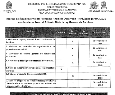 Informe de cumplimiento del Programa Anual de Desarrollo Archivistico (PADA) 2021 con fundamento en el Articulo 26 de la Ley General de Archvios.